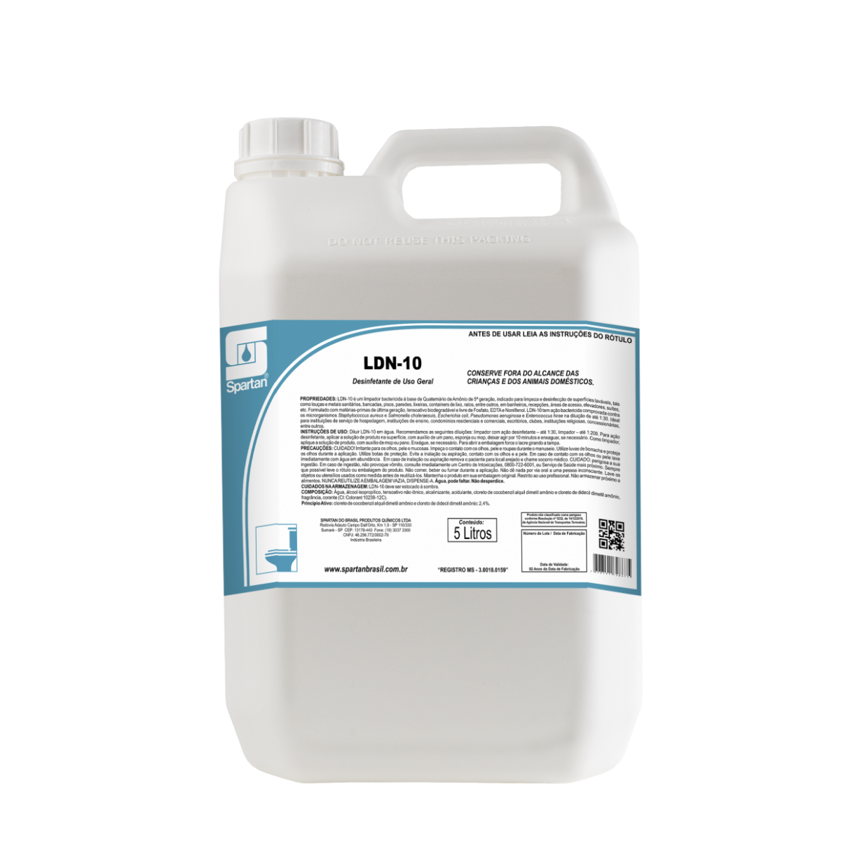 LDN-10 é um limpador bactericida à base de Quaternário de Amônio de 5ª geração, indicado para limpeza e desinfecção de superfícies laváveis, tais como louças e metais sanitários, bancadas, pisos, paredes, lixeiras, containers de lixo, ralos, entre outros, em banheiros, recepções, áreas de acesso, elevadores, suítes etc.